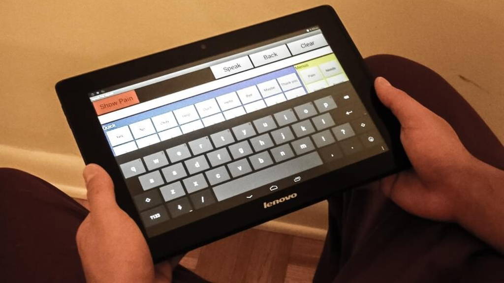 The app has a graphic for indicating the location of their pain and the level of pain they are experiencing. When a patient touches the screen to indicate the location of pain on the body graphic, the voice says “it hurts here.” Patients can use shortcuts and single words or type in phrases or full sentences to communicate their needs. The software is predictive so that if a patient begins to enter a word, the program will anticipate and present likely solutions.